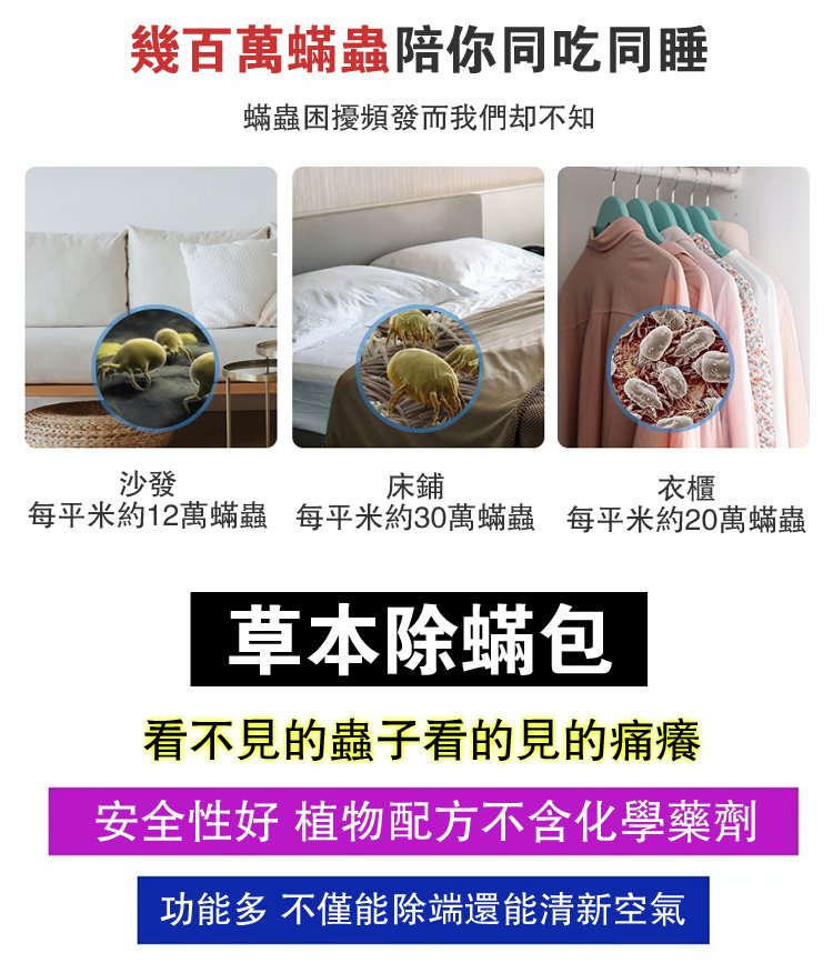 2分鐘前草本除蟎包「春夏季節」蟎蟲細菌容易滋生繁殖快,有了這款除草本除蟎包,在也不用擔心了!! - 「買二送五」七入組NT$1199(均價低至$171/盒)共70小包